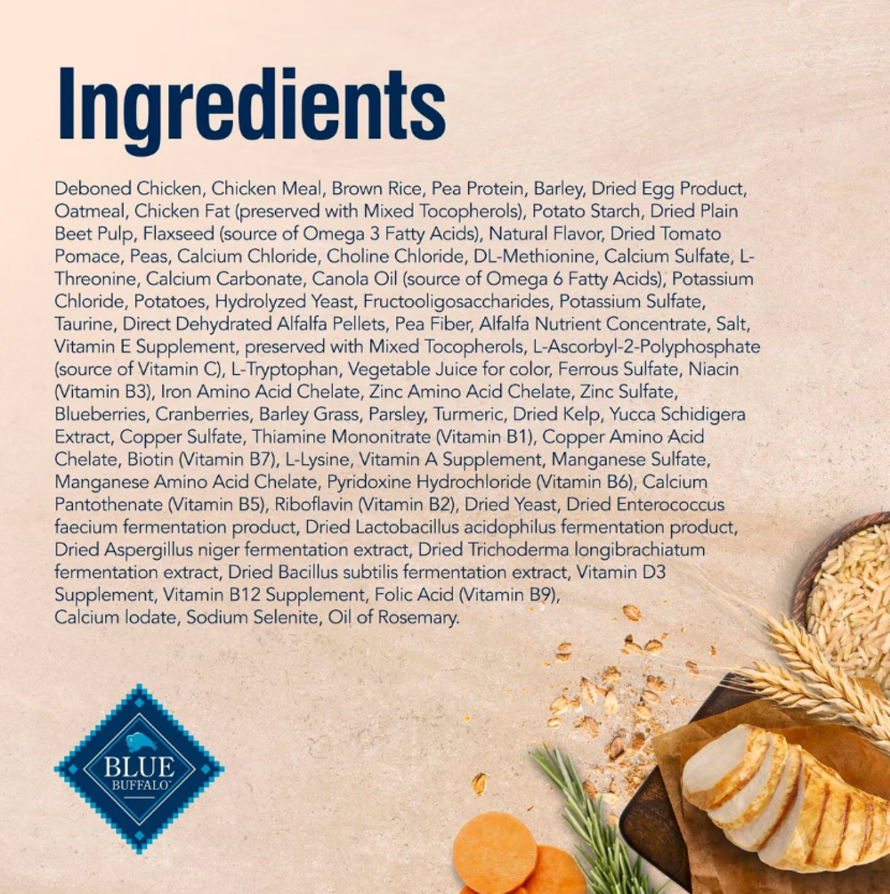 Deboned Chicken,Chicken Meal,Brown Rice,Pea Protein,Barley,Dried Egg Product,Oatmeal, Chicken Fat (preserved with Mixed Tocopherols),Potato Starch,Dried Plain Beet Pulp, Flaxseed (source of Omega 3 Fatty Acids), Natural Flavor,Dried Tomato Pomace,Peas,Calcium Chloride,Choline Chloride,DL-Methionine,Calcium Sulfate,L-Threonine,Calcium Carbonate,Canola Oil (source of Omega 6 Fatty Acids),Potassium Chloride,Potatoes,Hydrolyzed Yeast,Fructooligosaccharides,Potassium Sulfate,Taurine,Dehydrated Alfalfa Meal,Pea Fiber,Alfalfa Nutrient Concentrate,Salt,Vitamin E Supplement,preserved with Mixed Tocopherols,L-Ascorbyl-2-Polyphosphate (source of Vitamin C),L-Tryptophan,Vegetable Juice for color,Ferrous Sulfate,Niacin (Vitamin B3), Iron Amino Acid Chelate,Zinc Amino Acid Chelate,Zinc Sulfate, Blueberries,Cranberries,Barley Grass,Parsley,Turmeric,Dried Kelp,Yucca Schidigera Extract, Copper Sulfate,Thiamine Mononitrate (Vitamin B1),Copper Amino Acid Chelate,Biotin (Vitamin B7),L-Lysine,Vitamin A Supplement,Manganese Sulfate,Manganese Amino Acid Chelate,Pyridoxine Hydrochloride (Vitamin B6),Calcium Pantothenate (Vitamin B5),Riboflavin (Vitamin B2),Dried Yeast,Dried Enterococcus faecium fermentation product,Dried Lactobacillus acidophilus fermentation product,Dried Aspergillus niger fermentation extract,Dried Trichoderma longibrachiatum fermentation extract,Dried Bacillus subtilis fermentation extract, Vitamin D3 Supplement,Vitamin B12 Supplement,Folic Acid (Vitamin B9),Calcium Iodate,Sodium Selenite,Oil of RosemaryGuaranteed Analysis