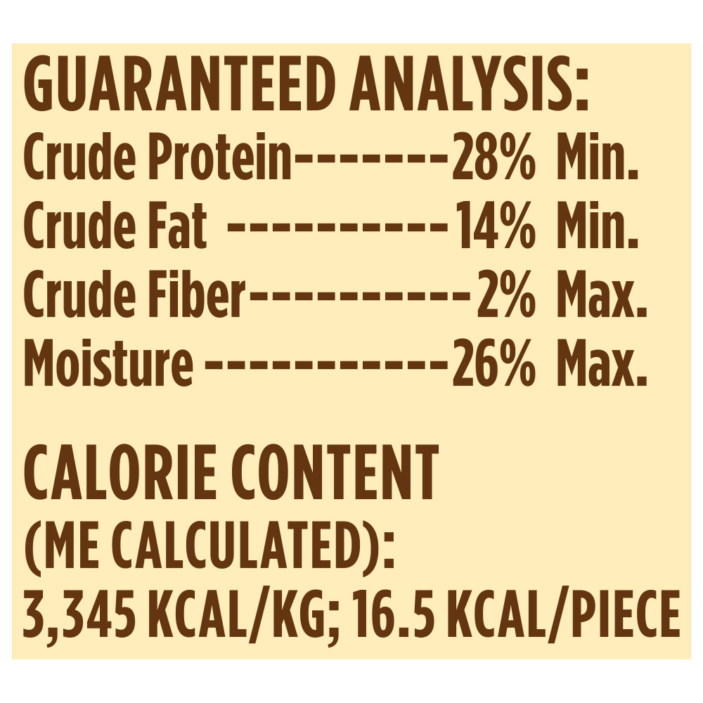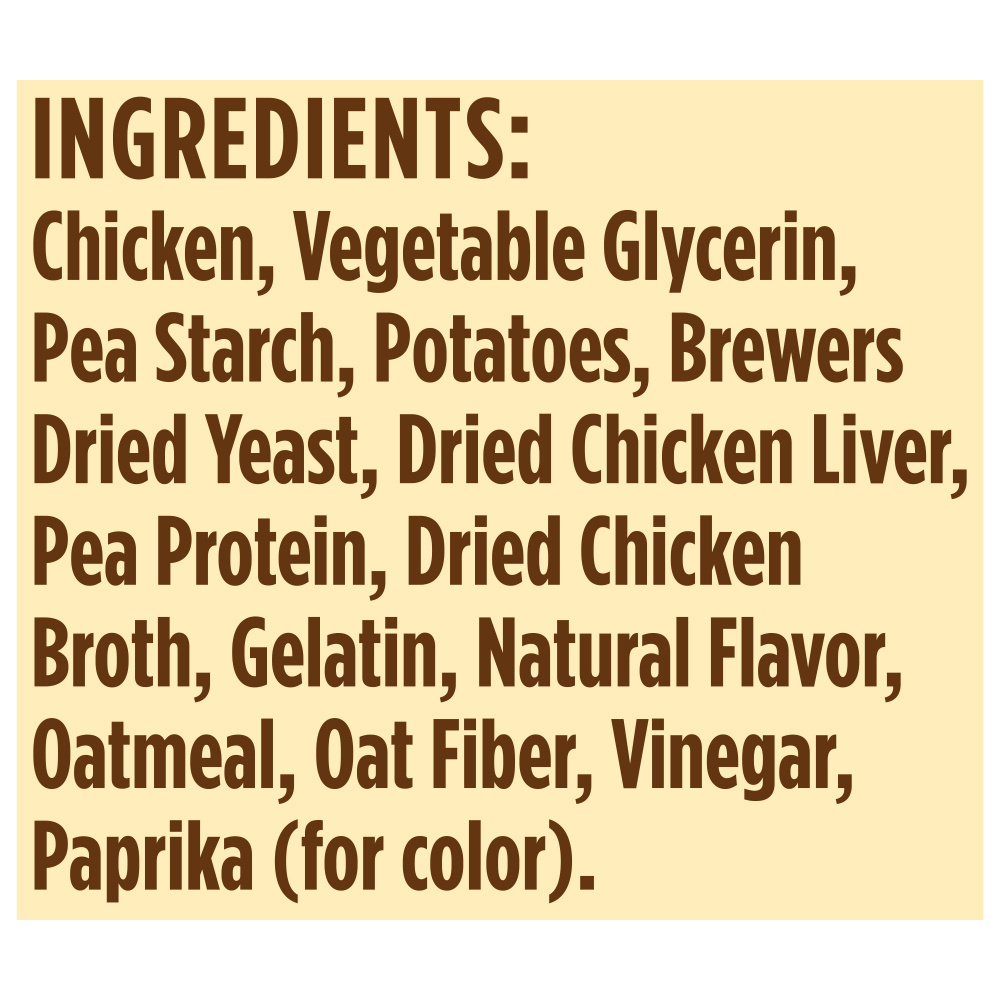 Chicken, Vegetable Glycerin, Pea Starch, Potatoes, Brewers Dried Yeast, Dried Chicken Liver, Pea Protein, Dried Chicken Broth, Gelatin, Natural Flavor, Oatmeal, Oat Fiber, Vinegar, Paprika Oleoresin (for color).Guaranteed Analysis