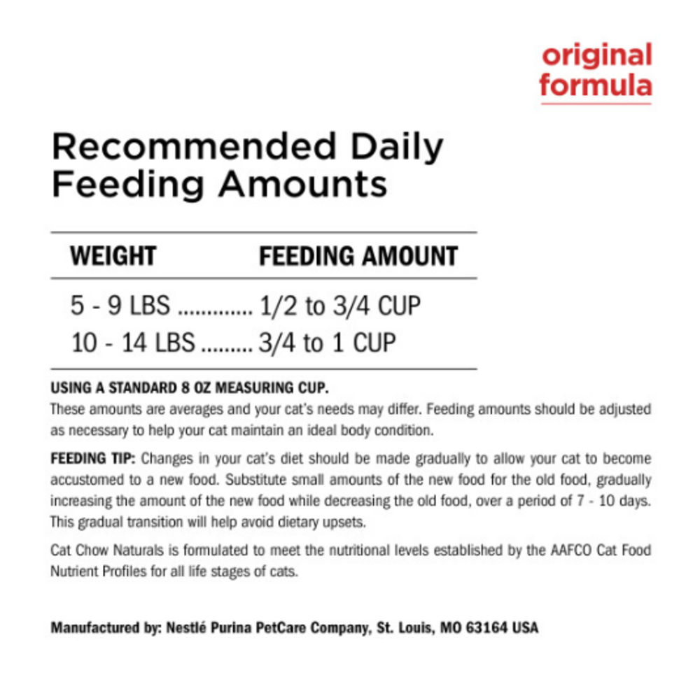 Serve your cat a great tasting meal with Purina Cat Chow Naturals Original Cat Kibble featuring high-quality ingredients like real chicken as the #1 ingredient. This wholesome weight management cat food is also made with real salmon and whole grains. Formulated for all life stages, this delicious hairball control cat food follows your cat through their kitten and adult years. Made without artificial flavors, colors or preservatives, each bite delivers more of the ingredients cats need without the ones they don't. Your cat gets a 100% complete and balanced Cat Chow indoor dry cat food at mealtime, and you get the comfort that comes from giving them a natural cat food backed by a trusted brand. With 25 essential vitamins and minerals, this Purina indoor cat food gives cats the nutrition they need to help them live a long, happy life with you. Make this Purina chicken and salmon cat food a part of their daily feeding routine and show your cat you care about their health and wellness.