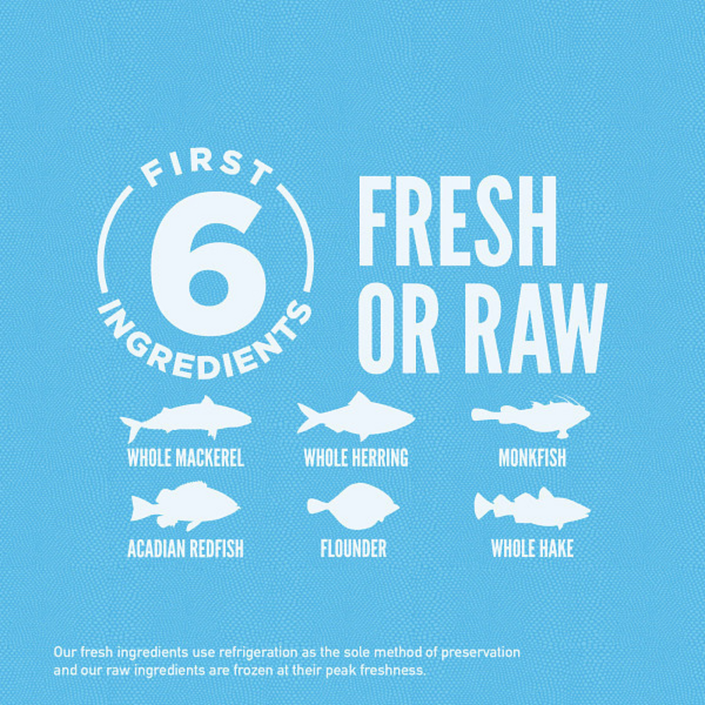 Whole herring, salmon, monkfish, Acadian redfish, flounder, whole hake, sardine meal, herring meal, blue whiting meal, pollock meal, whole red lentils, whole pinto beans, whole green lentils, dehydrated salmon, sunflower oil, whole navy beans, whole peas, natural fish flavor, dried apple pomace, herring oil, safflower oil, vitamin E supplement, mixed tocopherols (preservative), whole pumpkin, whole butternut squash, collard greens, whole apples, whole pears, dried kelp, zinc proteinate, niacin, thiamine mononitrate, calcium pantothenate, pyridoxine hydrochloride, riboflavin, folic acid, vitamin B12 supplement, copper proteinate, dried Bacillus coagulans fermentation product, dried chicory root, turmeric, sarsaparilla root, althea root, rosehips, juniper berries, citric acid (preservative), rosemary extract.