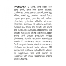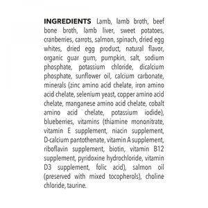 Lamb, lamb broth, beef bone broth, lamb liver, sweet potatoes, cranberries, carrots, salmon, spinach, dried egg whites, dried egg product, Natural flavor, organic guar gum, pumpkin, salt, sodium phosphate, potassium chloride, dicalcium phosphate, sunflower oil, calcium carbonate, minerals (zinc amino acid chelate, iron amino acid chelate, selenium yeast, copper amino acid chelate, manganese amino acid chelate, cobalt amino acid chelate, potassium iodide), blueberries, vitamins (thiamine mononitrate, vitamin E supplement, niacin supplement, D-calcium pantothenate, vitamin A supplement, riboflavin supplement, biotin, vitamin B12 supplement, pyridoxine hydrochloride, vitamin D3 supplement, folic acid), salmon oil (preserved with mixed tocopherols), choline chloride, taurine.