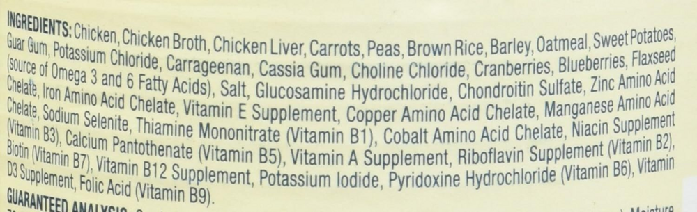 Chicken,Chicken Broth, Chicken Liver, Carrots, Peas,Brown Rice,Barley,Oatmeal,Sweet Potatoes,Guar Gum, Potassium Chloride,Carrageenan,Cassia Gum,Salt,Flaxseed, Cranberries,Blueberries,Choline Chloride,Zinc Amino Acid Chelate,Iron Amino Acid Chelate,Vitamin E Supplement,Copper Amino Acid Chelate,Manganese Amino Acid Chelate,Sodium Selenite,Thiamine Mononitrate (Vitamin B1),Cobalt Amino Acid Chelate,Niacin Supplement (Vitamin B3),Calcium Pantothenate (Vitamin B5),Vitamin A Supplement,Riboflavin Supplement (Vitamin B2),Biotin (Vitamin B7),Vitamin B12 Supplement,Potassium Iodide,Pyridoxine Hydrochloride (Vitamin B6),Vitamin D3 Supplement,Folic Acid (Vitamin B9)Guaranteed Analysis