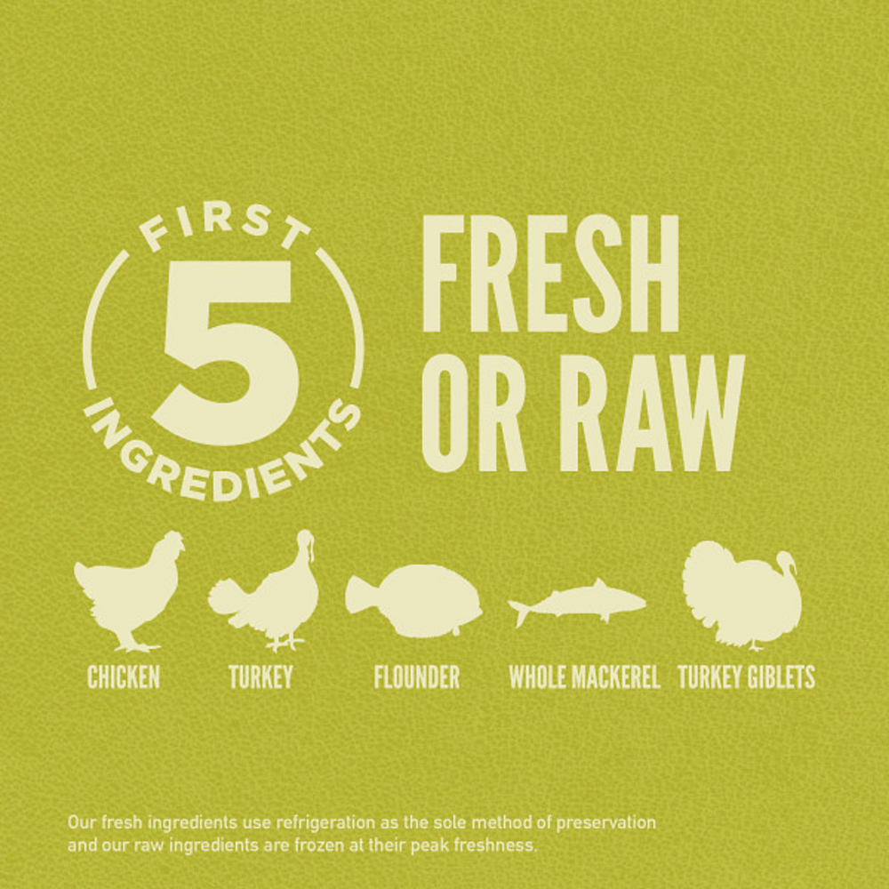 - The first 5 ingredients are fresh or raw poultry and fish ingredients. Our fresh ingredients use refrigeration as the sole method of preservation and our raw ingredients are frozen at their peak freshness.