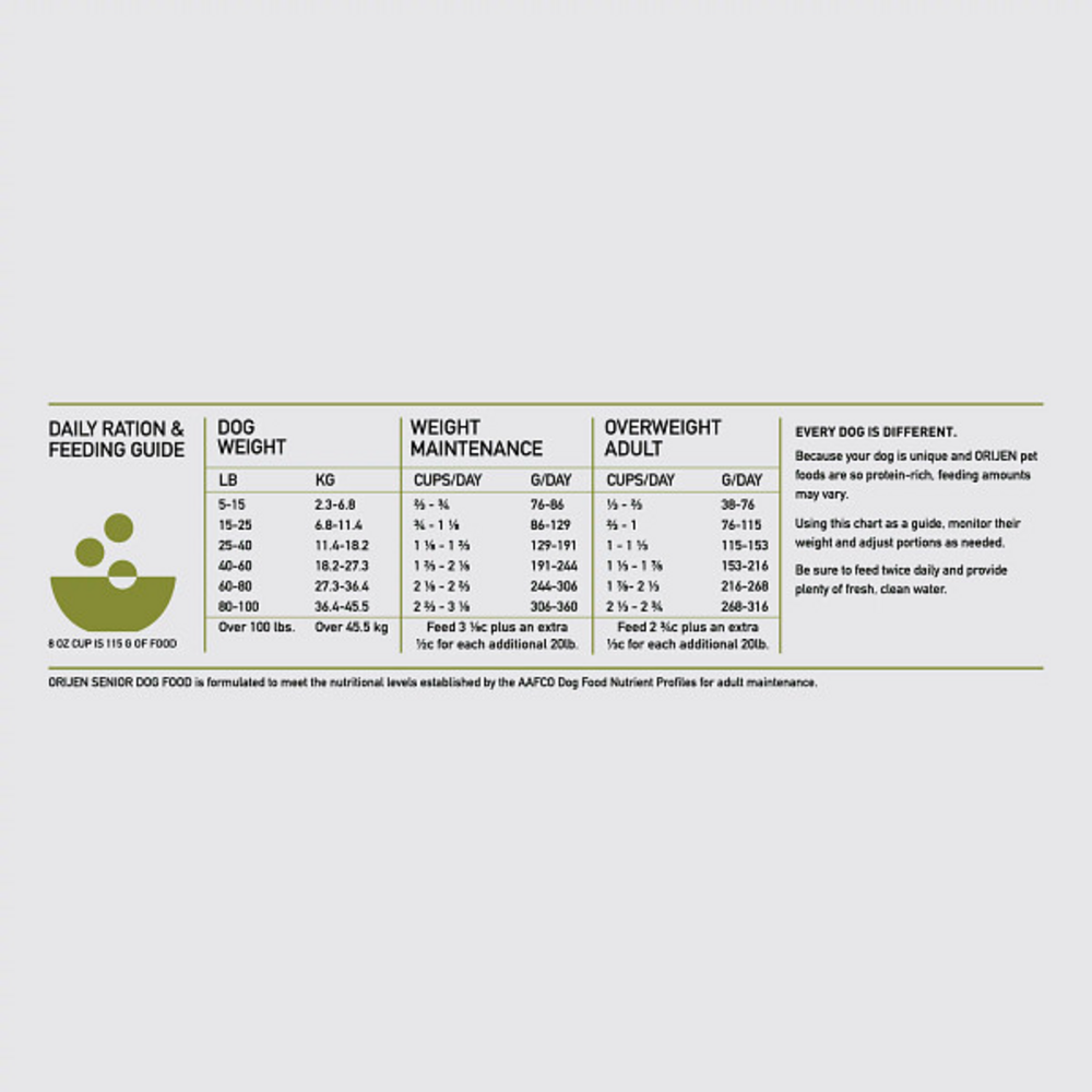 Help your senior dog stay healthy and active with ORIJEN Senior Grain Free* Dry Dog Food. Made with naturally occurring Omega-3 and Omega-6 fatty acids, plus Chondroitin and Glucosamine, this senior dog food kibble provides the nutrients needed to help support your senior dog's joint health. This ORIJEN dog food recipe contains 85 percent** animal ingredients like free-run chicken, free-run turkey and wild-caught fish to support a healthy weight. The first five ingredients of this high protein dog food are fresh or raw chicken, turkey, salmon, whole herring and chicken liver, giving your dog a strong source of protein, vitamins and minerals. Inspired by what your dog’s ancestors consumed in the wild, each serving offers ORIJEN WholePrey ingredients to provide your dog with the most succulent and nutrient-rich parts of the prey, and a freeze dried coating that provides a burst of flavor dogs instinctively crave. Our included fresh ingredients are delivered refrigerated and our included raw ingredients are delivered frozen. NOURISH AS NATURE INTENDED. *Produced in a facility that also processes grains **Approximate 85%, and derived from the unprocessed state of the ingredients