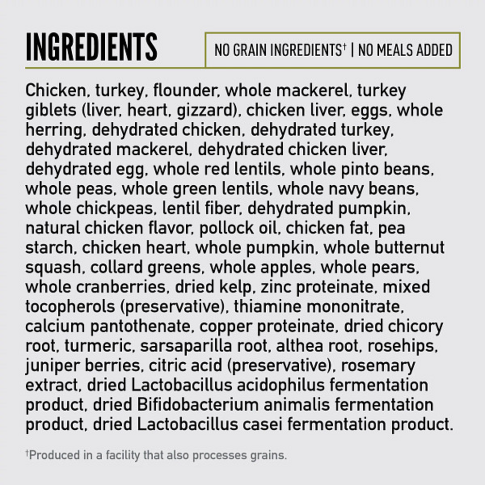 Chicken, turkey, salmon, whole herring, chicken liver, dehydrated chicken, dehydrated sardine, dehydrated chicken liver, dehydrated egg, whole red lentils, whole pinto beans, whole navy beans, whole green lentils, whole chickpeas, whole peas, dried apple pomace, turkey giblets (liver, heart, gizzard), eggs, dehydrated turkey, natural chicken flavor, dehydrated pumpkin, pollock oil, chicken fat, lentil fiber, chicken heart, vitamin E supplement, whole pumpkin, whole butternut squash, collard greens, whole apples, whole pears, whole cranberries, dried kelp, zinc proteinate, mixed tocopherols (preservative), niacin, thiamine mononitrate, calcium pantothenate, pyridoxine hydrochloride, riboflavin, folic acid, vitamin B12 supplement, copper proteinate, dried Bacillus coagulans fermentation product, dried chicory root, turmeric, sarsaparilla root, althea root, rosehips, juniper berries, citric acid (preservative), rosemary extract.