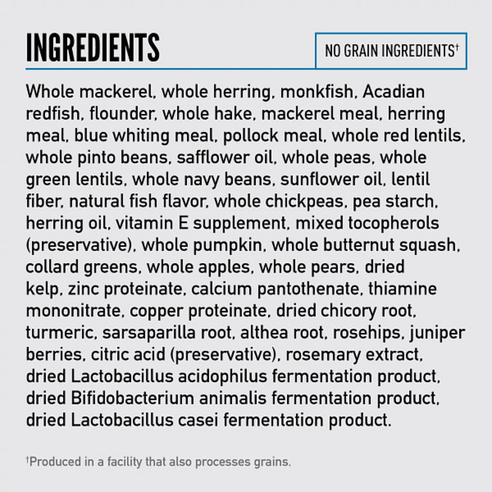 Whole herring, salmon, monkfish, Acadian redfish, flounder, whole hake, sardine meal, herring meal, blue whiting meal, pollock meal, whole red lentils, whole pinto beans, whole green lentils, dehydrated salmon, sunflower oil, whole navy beans, whole peas, natural fish flavor, dried apple pomace, herring oil, safflower oil, vitamin E supplement, mixed tocopherols (preservative), whole pumpkin, whole butternut squash, collard greens, whole apples, whole pears, dried kelp, zinc proteinate, niacin, thiamine mononitrate, calcium pantothenate, pyridoxine hydrochloride, riboflavin, folic acid, vitamin B12 supplement, copper proteinate, dried Bacillus coagulans fermentation product, dried chicory root, turmeric, sarsaparilla root, althea root, rosehips, juniper berries, citric acid (preservative), rosemary extract.