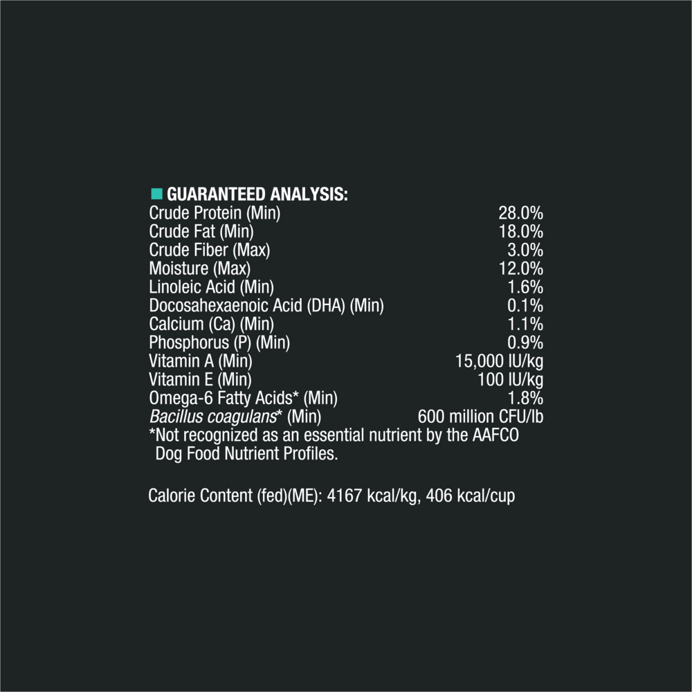 Chicken, Rice, Poultry By-Product Meal, Corn Gluten Meal, Beef Fat Preserved With Mixed-tocopherols, Soybean Meal, Whole Grain Wheat, Whole Grain Corn, Corn Germ Meal, Dried Egg Product, Natural Flavor, Dried Yeast, Glycerin, Fish Meal, Fish Oil, Calcium Carbonate, Soybean Oil, Mono And Dicalcium Phosphate, Salt, Potassium Chloride, Minerals [Zinc Proteinate, Manganese Proteinate, Ferrous Sulfate, Copper Proteinate, Calcium Iodate, Sodium Selenite], Choline Chloride, Vitamins [Vitamin E Supplement, Niacin (Vitamin B-3), Vitamin A Supplement, Calcium Pantothenate (Vitamin B-5), Thiamine Mononitrate (Vitamin B-1), Vitamin B-12 Supplement, Riboflavin Supplement (Vitamin B-2), Pyridoxine Hydrochloride (Vitamin B-6), Folic Acid (Vitamin B-9), Vitamin D-3 Supplement, Menadione Sodium Bisulfite Complex (Vitamin K), Biotin (Vitamin B-7)], Dried Bacillus Coagulans Fermentation Product, Garlic Oil. F448919Crude Protein (Min)...28.0% , Crude Fat (Min)...18.0% , Crude Fiber (Max)...3.0% , Moisture (Max)...12.0% , Linoleic Acid (Min)...1.6% , Docosahexaenoic Acid (DHA) (Min)...0.1% , Calcium (Ca) (Min)...1.1% , Phosphorus (P) (Min)...0.9% , Vitamin A (Min)...15,000 IU/kg , Vitamin E (Min)...100 IU/kg , Omega-6 Fatty Acids* (Min)...1.8% , Bacillus coagulans* (Min)...600 million CFU/lb *Not recognized as an essential nutrient by the AAFCO Dog Food Nutrient Profiles.