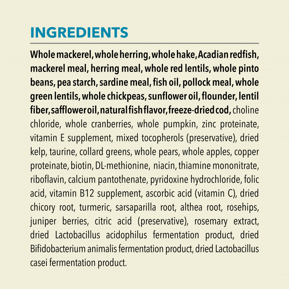 Whole mackerel, whole herring, whole hake, Acadian redfish, mackerel meal, herring meal, whole red lentils, whole pinto beans, pea starch, sardine meal, fish oil, pollock meal, whole green lentils, whole chickpeas, sunflower oil, flounder, lentil fiber, safflower oil, natural fish flavor, freeze-dried cod, choline chloride, whole cranberries, whole pumpkin, zinc proteinate, vitamin E supplement, mixed tocopherols (preservative), dried kelp, taurine, collard greens, whole pears, whole apples, copper proteinate, biotin, DL-methionine, niacin, thiamine mononitrate, riboflavin, calcium pantothenate, pyridoxine hydrochloride, folic acid, vitamin B12 supplement, ascorbic acid (vitamin C), dried chicory root, turmeric, sarsaparilla root, althea root, rosehips, juniper berries, citric acid (preservative), rosemary extract, dried Lactobacillus acidophilus fermentation product, dried Bifidobacterium animalis fermentation product, dried Lactobacillus casei fermentation product.