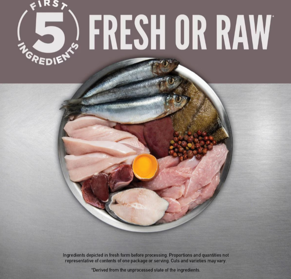 Chicken, chicken liver, whole herring, turkey, turkey giblets (liver, heart, gizzard), flounder, eggs, cod, dehydrated chicken liver, dehydrated egg, dehydrated sardine, dehydrated chicken, dehydrated turkey, dehydrated herring, whole red lentils, whole pinto beans, whole peas, whole navy beans, chicken fat, natural fish flavor, dehydrated pumpkin, lentil fiber, whole green lentils, whole chickpeas, chicken heart, choline chloride, dried kelp, zinc proteinate, whole pumpkin, whole butternut squash, whole apples, whole pears, collard greens, whole cranberries, mixed tocopherols (preservative), thiamine mononitrate, niacin, pyridoxine hydrochloride, vitamin E supplement, dried Bacillus coagulans fermentation product, dried chicory root, turmeric, sarsaparilla root, althea root, rosehips, juniper berries, citric acid (preservative), rosemary extract.