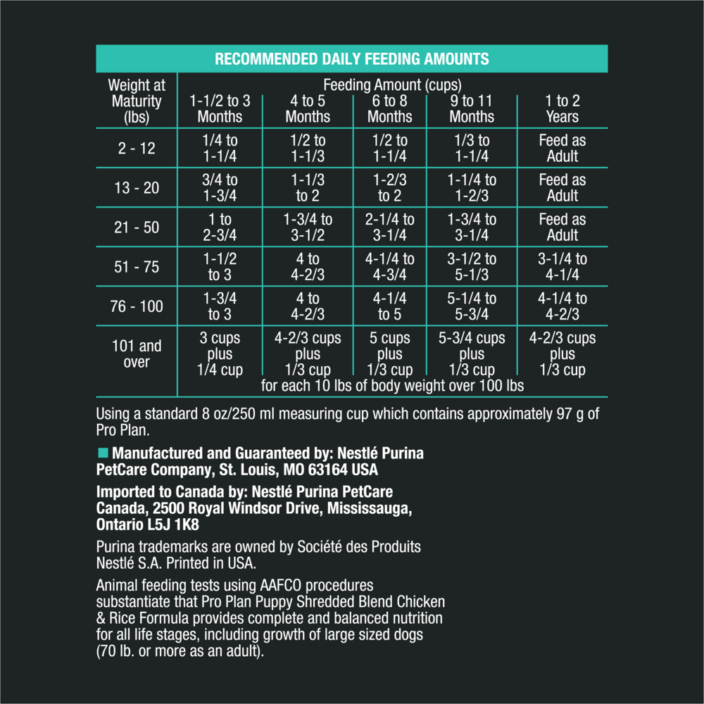 Give your precious puppy wholesome ingredients and 100 percent complete and balanced puppy nutrition with Purina Pro Plan Brand Dog Food Puppy Shredded Blend Chicken and Rice Formula dry puppy food. Real chicken as the first ingredient and rice, a good source of carbohydrates for energy, are part of a formula that provides your little guy with the outstanding nutrition he needs and taste he craves. The highly digestible puppy food formula allows for optimal nutrition delivery contains no artificial colors or flavors to meet your high standards. Plus, the tempting pieces of hard kibble and tender shreds in this chicken and rice dog food are sized appropriately for his mouth and teeth. DHA from omega-rich fish oil nourishes brain and vision development, and the antioxidant-rich formula supports his developing immune system. We fortify this puppy food with guaranteed live probiotics for digestive and immune health, while phosphorus, calcium and other minerals build strong teeth and bones to help your puppy grow up big and strong. Specially designed for puppies under one year and with so much packed into every bite, this Purina Pro Plan Brand Dog Food Puppy Shredded Blend Chicken and Rice Formula dry puppy food lets you feel good about the food you serve him, and he is sure to love the flavors in every bite.